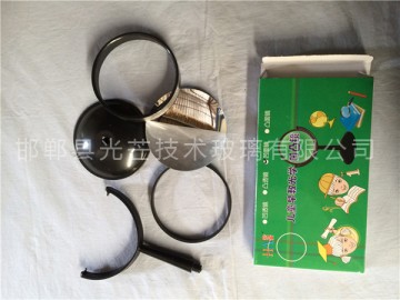 帶底座凹透鏡 直徑:10厘米 焦距:負(fù)300mm 幼兒園小朋友 或者中小學(xué)生認(rèn)識(shí)凹透鏡的特點(diǎn) 學(xué)習(xí)凹透鏡光學(xué)原理的的器材 尺寸大也時(shí)候教師教學(xué)演示用教具 知識(shí)拓展閱讀: 凸透鏡與凹透鏡可以從以下幾個(gè)方面加以區(qū)別:外形特征、對(duì)光線的作用、成像特點(diǎn)及用途等。具體方法如下: 方法一:用手摸,鏡子的中央部分比邊緣厚的是凸透鏡,鏡子的中央部分比邊緣薄的是凹透鏡。 方法二:隔著鏡子觀察距鏡子較近的書(shū)上的字,有放大作用的是凸透鏡;字變小的是凹透鏡。 方法三:隔著鏡子觀察距鏡子較近的書(shū)上的字,移動(dòng)鏡子,若發(fā)現(xiàn)像的移動(dòng)方向總是與鏡子的移動(dòng)方向相同,則該鏡子是凹透鏡;若發(fā)現(xiàn)像的移動(dòng)方向總是與鏡子的移動(dòng)方向相反,則該鏡子是凸透鏡。 方法四:隔著鏡子觀察窗外的物體,若能看到上下左右都顛倒的像,這種鏡子是凸透鏡;若看到像是正立的,這種鏡子是凹透鏡。 方法五:將點(diǎn)燃的蠟燭放在離透鏡適當(dāng)距離處,在另一側(cè)光屏上能得到倒立實(shí)像的是凸透鏡;無(wú)論怎樣調(diào)節(jié),在另一側(cè)光屏上不能得到像的是凹透鏡。 方法六:讓鏡子正對(duì)太陽(yáng)光照射,在鏡子的另一側(cè)放一張與透鏡平行的白色卡片紙,耐心調(diào)節(jié)鏡子與紙之間的距離,能得到一個(gè)小亮點(diǎn)的是凸透鏡;始終不能獲得小亮點(diǎn)的是凹透鏡。 方法七:觀察陽(yáng)光通過(guò)了兩副眼鏡在地面上形成的光斑,若形成光斑的中間比四周明亮,則鏡子是凸透鏡;若形成光斑的中間比四周暗,則鏡子是凹透鏡。 方法八:近視眼鏡,是用凹透鏡做成的。老花鏡,是用凸透鏡做成的。 說(shuō)明:辨別凸透鏡與凹透鏡有好多方法,哪種方法好,要視具體情況而定。例如,如果待辨別透鏡的中央與邊緣的厚薄差異不明顯,就不能用“摸”的方法(況且精密光學(xué)儀器是不允許直接用手去摸的);在有太陽(yáng)光與沒(méi)有太陽(yáng)光的場(chǎng)合,所選的方法也不同。總之,一種好方法,應(yīng)該簡(jiǎn)便、易行、有效。它是隨場(chǎng)合變化而變化的,不宜一概而論。 技巧:當(dāng)你想要判別兩件事物的相同和不同之處時(shí),就需要用比較與對(duì)比的方法。比較就是找出事物的相似性,即共同特征。對(duì)比是找出事物的不同點(diǎn)。用這種方法來(lái)分析事物,能幫助你發(fā)現(xiàn)一些平時(shí)容易忽略的細(xì)節(jié)。