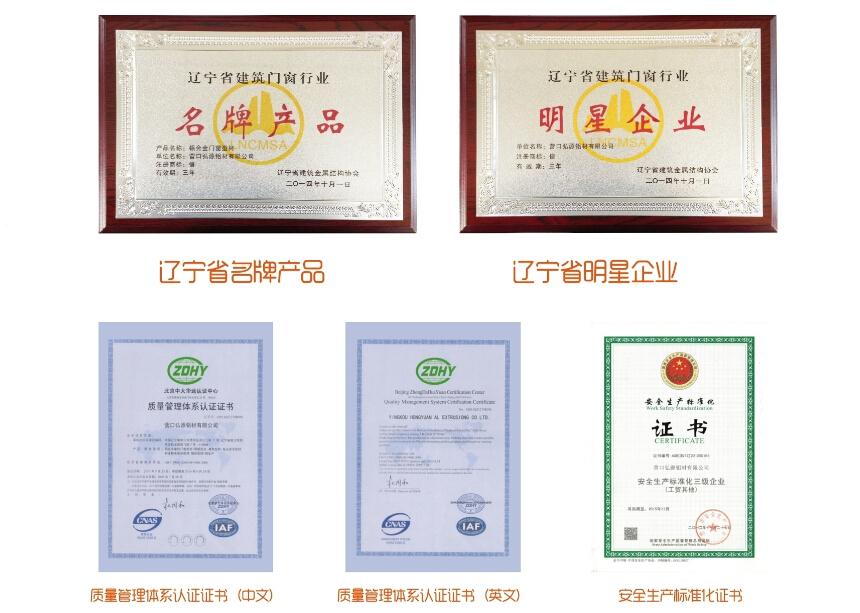 2014年,遼寧省建筑金屬結(jié)構(gòu)協(xié)會頒發(fā)遼寧省建筑門窗行業(yè)“名牌產(chǎn)品證書”、“明星企業(yè)證書”、鋁合金型材、鋁合金幕墻“定點生產(chǎn)企業(yè)證書”;
